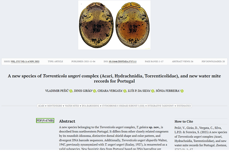 A new BGE paper has been published! The paper called ‘A new species of Torrenticola ungeri complex (Acari, Hydrachndia, Torrenticolidae), and new water mite records for Portugal’ was written by Vladimir Pešić, Dinis Girão, Chiara Vergata, Luís P. Da Silva and Sónia Ferreira.