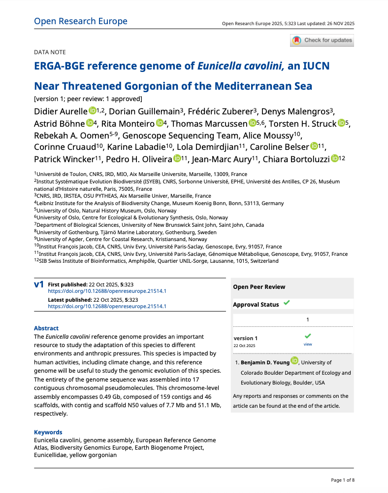- Aurelle, D., Guillemain, D., Zuberer, F., Malengros, D., Böhne, A., Monteiro, R., … & Bortoluzzi, C. (2025). ERGA-BGE reference genome of Eunicella cavolini, an IUCN Near Threatened Gorgonian of the Mediterranean Sea. Open Research Europe, 5, 323.